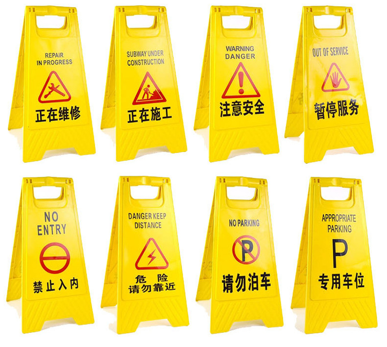 使用说明:外观平整光滑,不容易老化。配有中英文字体,内容为:工作进行中,请勿泊车,禁止入内,清洁卫生,专用车位,正在施工,注意安全,小心台阶,保养中,止步高压危险,空白定做,小心地滑,正在维修,危险请勿靠近,暂停服务等图案多种多样。一般适用于酒店、地铁、餐馆、大厦、超市、车站等需要提醒行人注意的公共场所。使用比较简单,按图片下面字样,挑选自己需要的类型以后,摆放在需要的地方就可以了。如果有风防止吹跑的话,可以两个套在一起使用。