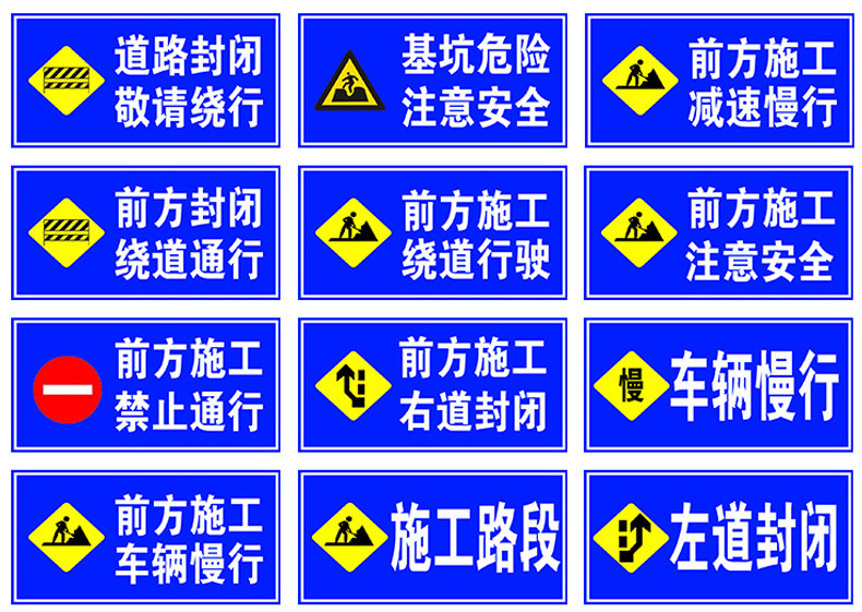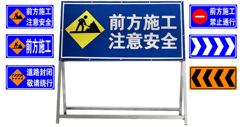 施工架子板面内容是可以定制的,内容比较多,一般为:前方施工,前方施工M,前方施工车辆慢行,前方施工给您带来不便,敬请谅解,前方施工减速慢行,前方施工禁止通行,前方施工注意安全,前方施工左道封闭,前方施工右道封闭,施工路段,向左改道,向右改道,左侧变窄,右侧变窄,左道封闭,右道封闭,道路施工,道路封闭,道路封闭敬请绕行,左导向(蓝白),右导向(蓝白),左导向(黄黑),等规格。具体的可以看下面的图案。也可以打电话咨询定制,前方施工导向牌定制联系方式:15036123921( 李经理)