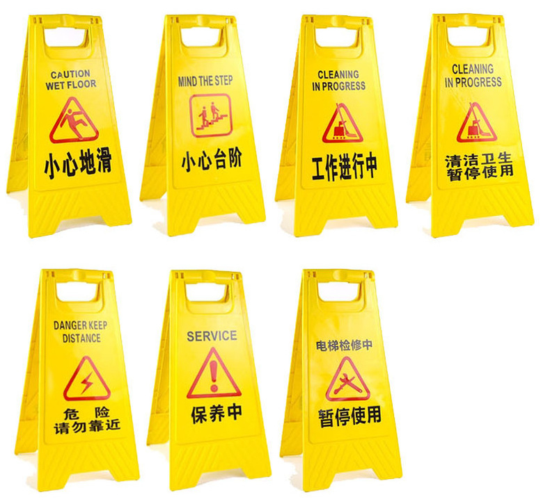 使用说明:外观平整光滑,不容易老化。配有中英文字体,内容为:工作进行中,请勿泊车,禁止入内,清洁卫生,专用车位,正在施工,注意安全,小心台阶,保养中,止步高压危险,空白定做,小心地滑,正在维修,危险请勿靠近,暂停服务等图案多种多样。一般适用于酒店、地铁、餐馆、大厦、超市、车站等需要提醒行人注意的公共场所。使用比较简单,按图片下面字样,挑选自己需要的类型以后,摆放在需要的地方就可以了。如果有风防止吹跑的话,可以两个套在一起使用。